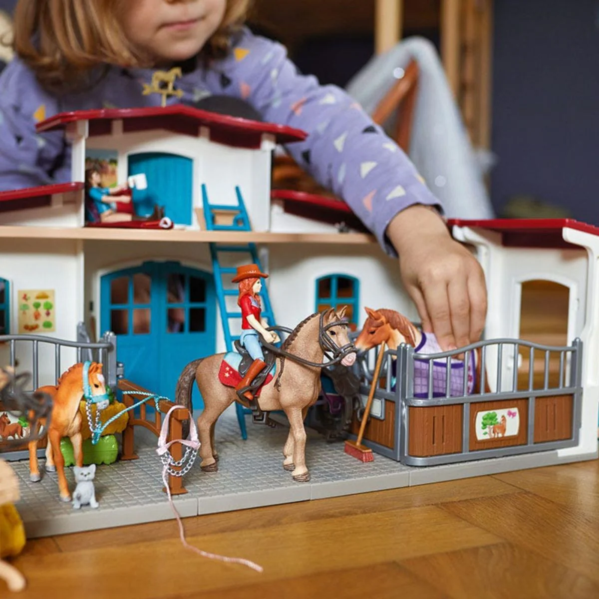 Yaaaaaawn! Wake up, sleepy head! While you've been snoozing in the loft, other equestrians at Lakeside Riding Center have been getting time in the saddle. Shimmy down the ladder and hurry to the stalls, where your horse is nibbling hay and waiting patiently. Ooooh, maybe after practicing your saddle gait you could take a trail ride to the Rider Café (playset sold separately) for a slice of fresh-baked apple pie! It's gonna be a fully day at Lakeside!